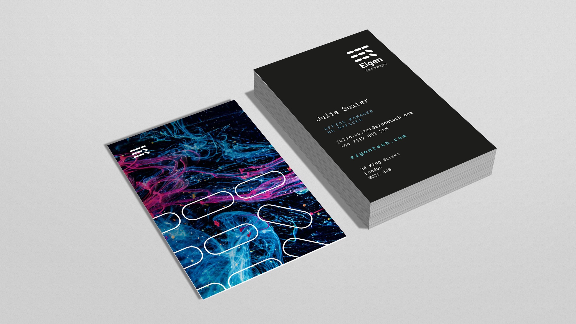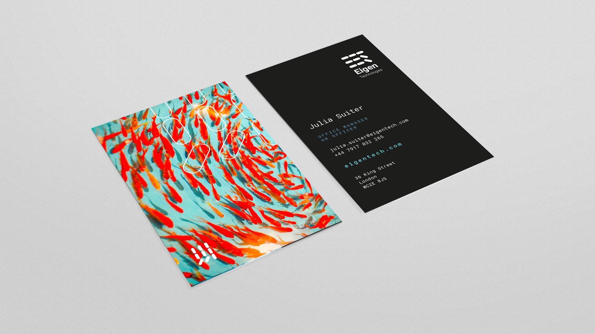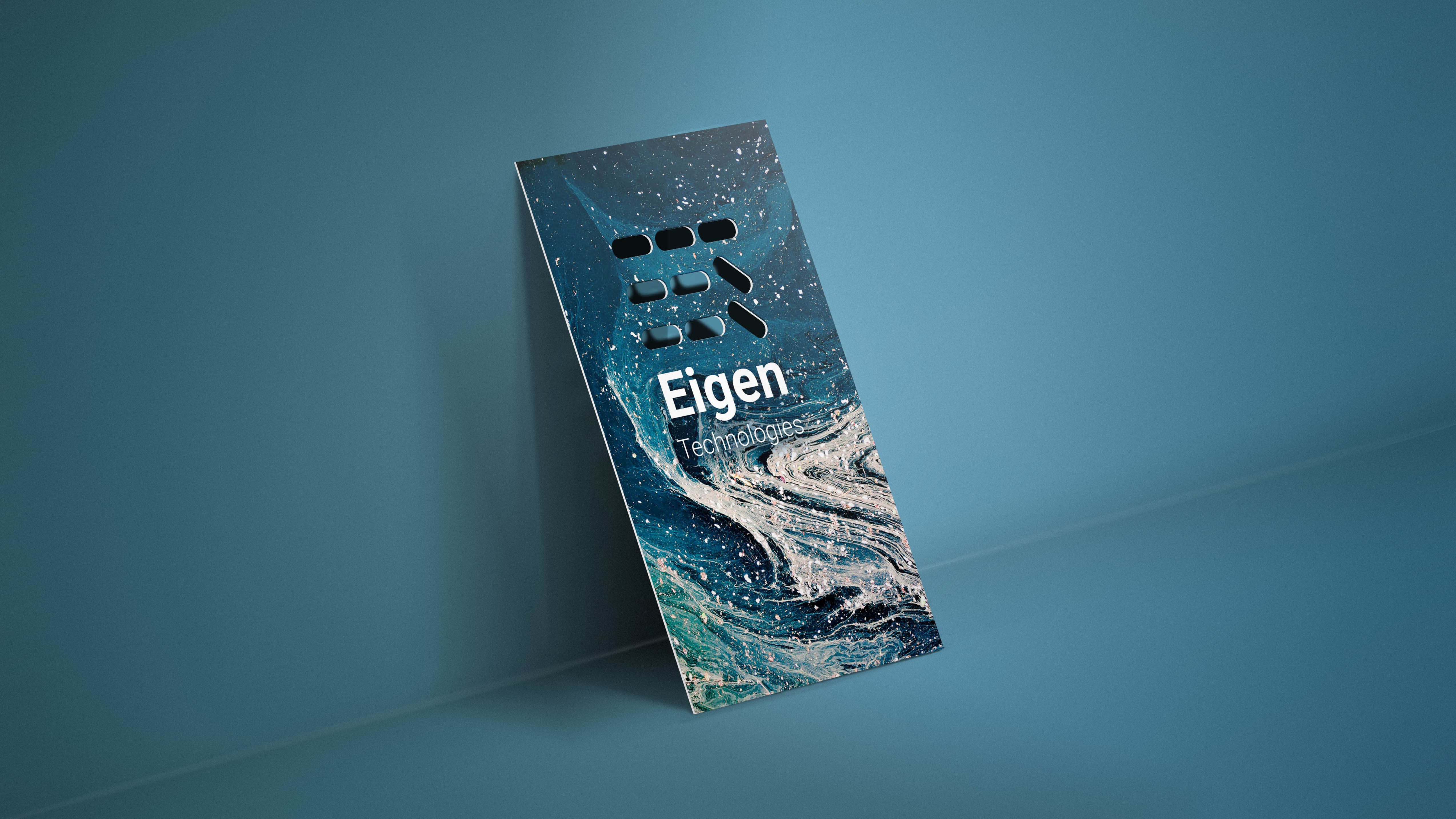 Business communications artwork for Eigen Technologies that balances precision with motion—clean typography grounded by expressive, fluid imagery. The system explores contrast: rigid structure against organic flow, technology softened by texture. Designed to feel intelligent, contemporary, and quietly confident rather than loud.