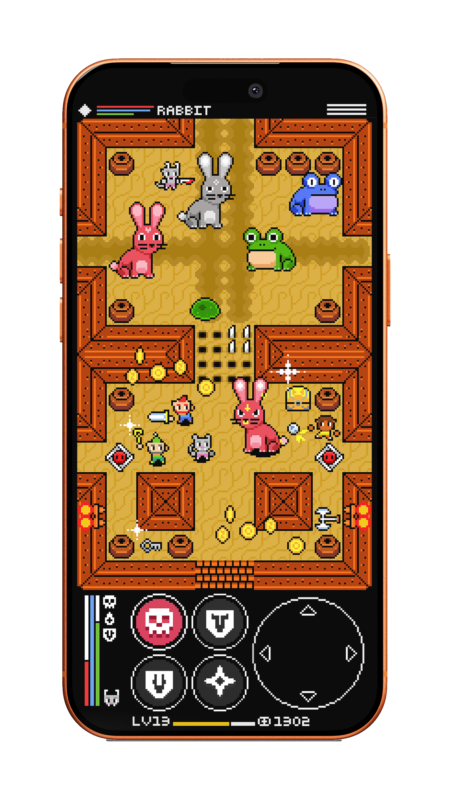 The game explores procedurally generated dungeons designed to feel handcrafted, using clear layouts, bold colour palettes, and distinct biomes to keep each run fresh and readable. UI and controls are built directly into the visual language of the game, supporting fast, one-handed play while keeping the experience energetic, cohesive, and full of 8-bit retro personality.